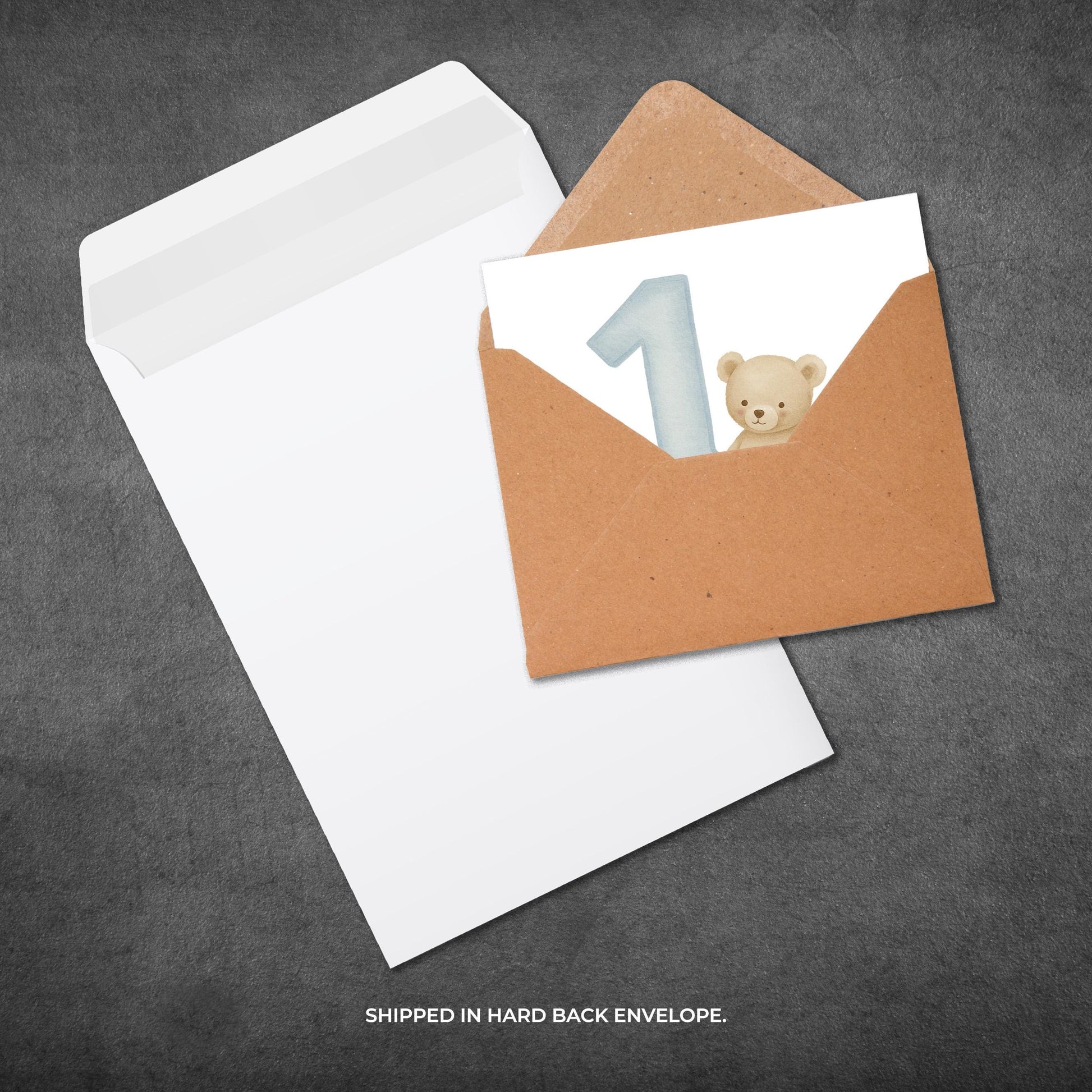 Their first birthday - and your first tearful photo op. This sweet teddy card is perfect for celebrating a baby boy’s big milestone. With soft watercolour tones, a gentle blue colour scheme and the cutest bear, it’s an ideal pick for sons, grandsons, or nephews turning one. Personalised with their name for extra keepsake charm.