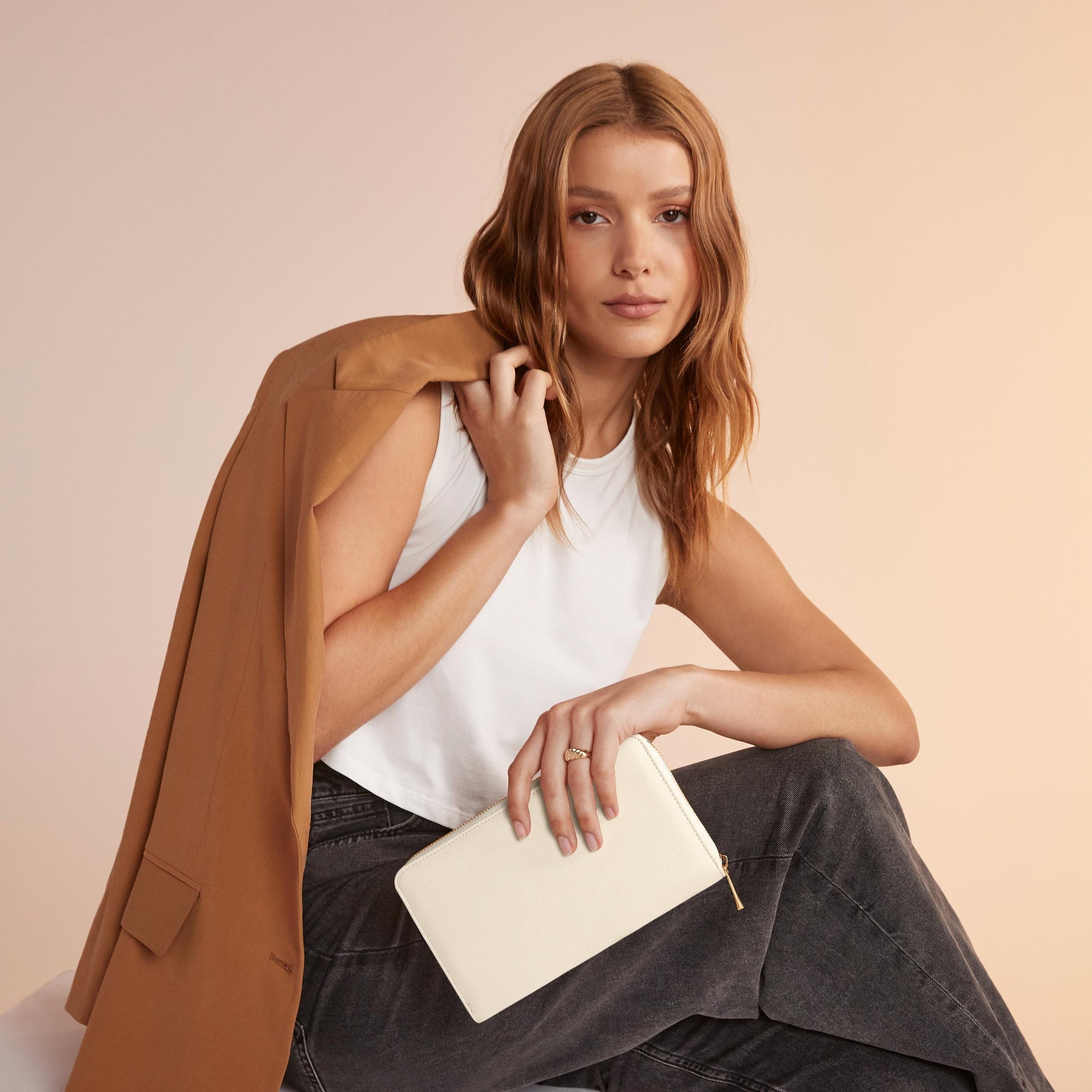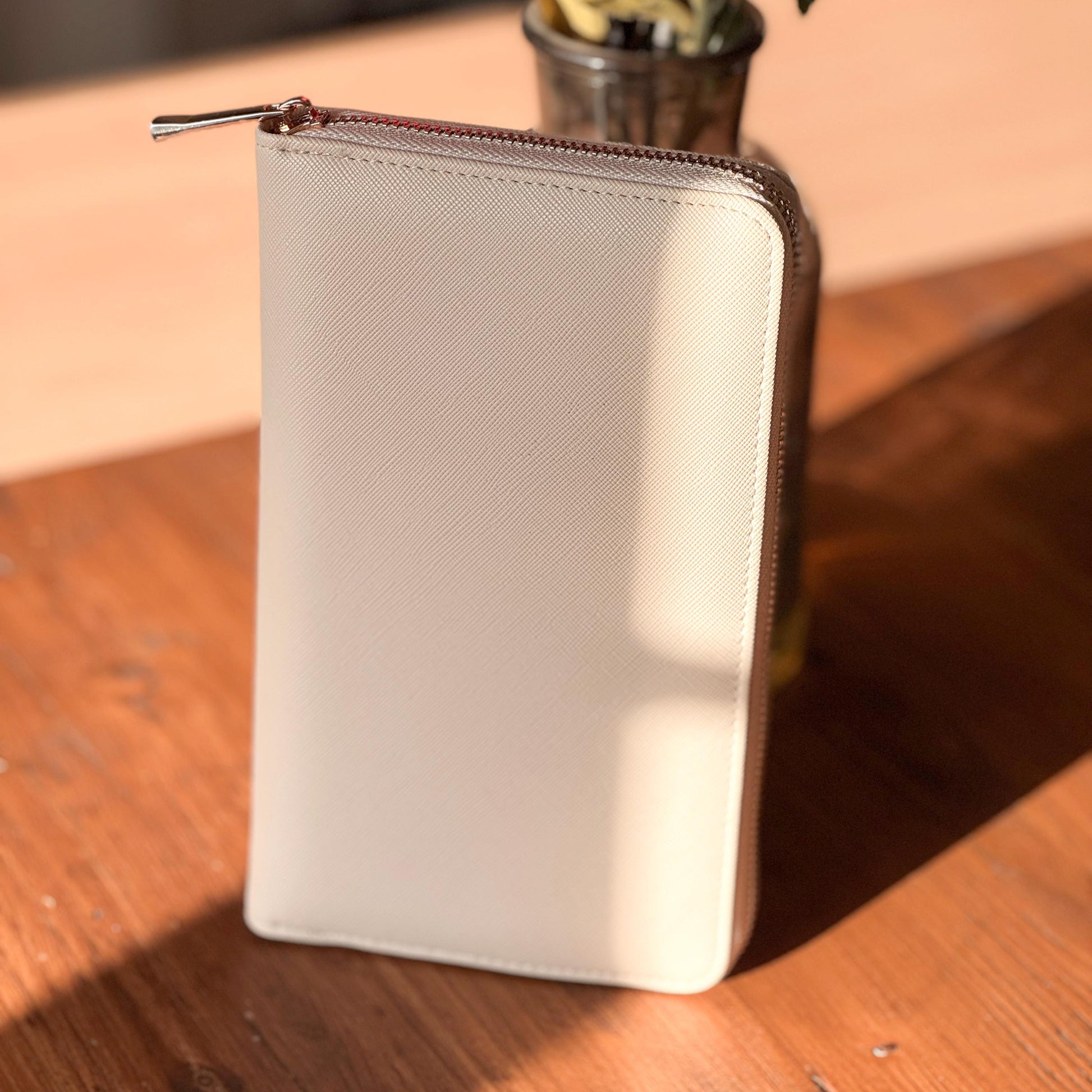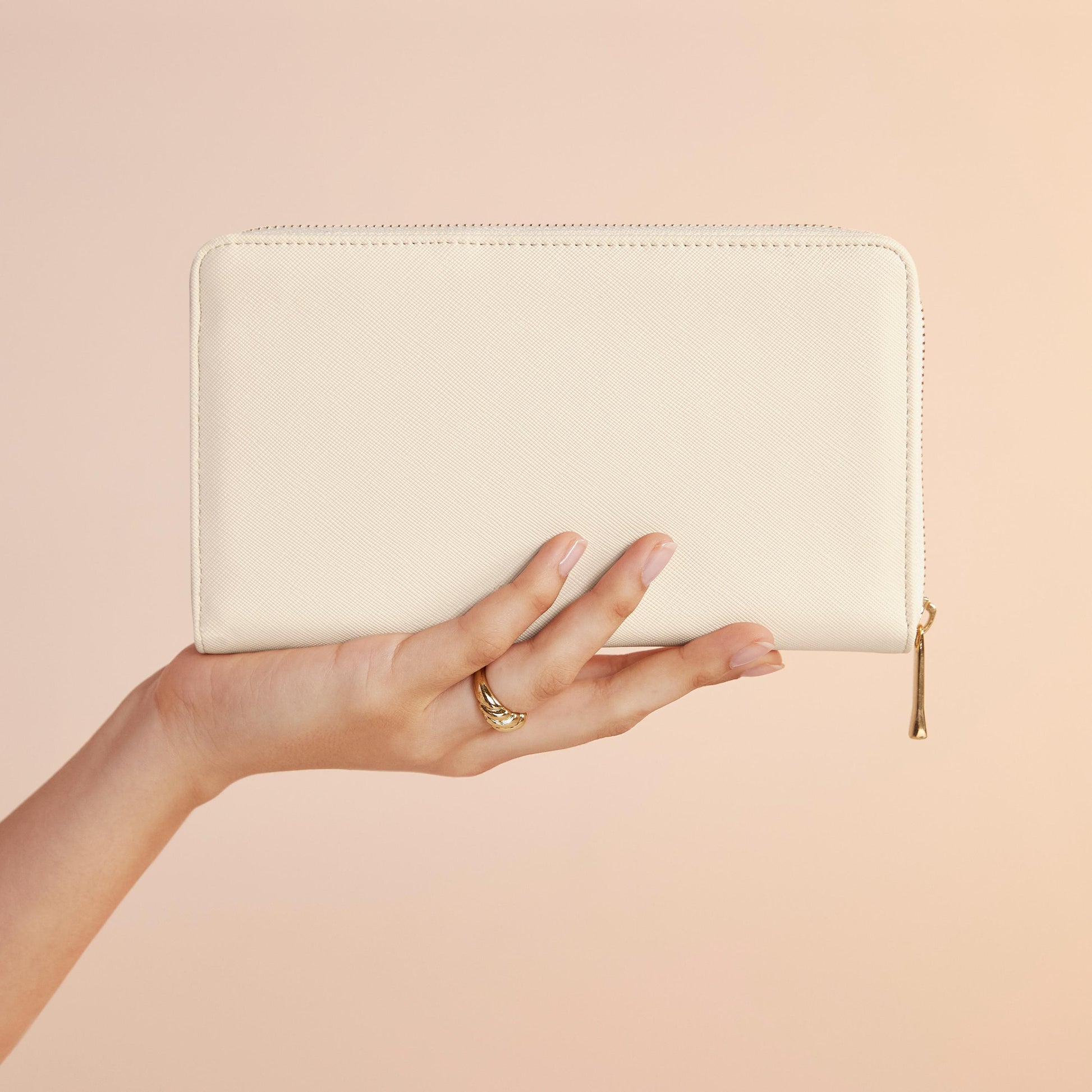 Elegant, timeless, and made for meaningful gifting. This cream travel jewellery case is crafted from saffiano-style leather-look PU with a slim structured shape and finished with a high-shine gold zip. Inside, it features a soft-touch velvet lining with necklace hooks, a detachable earring organiser, ring holders, and zipped compartments — everything needed to keep jewellery safe at home or on the go.