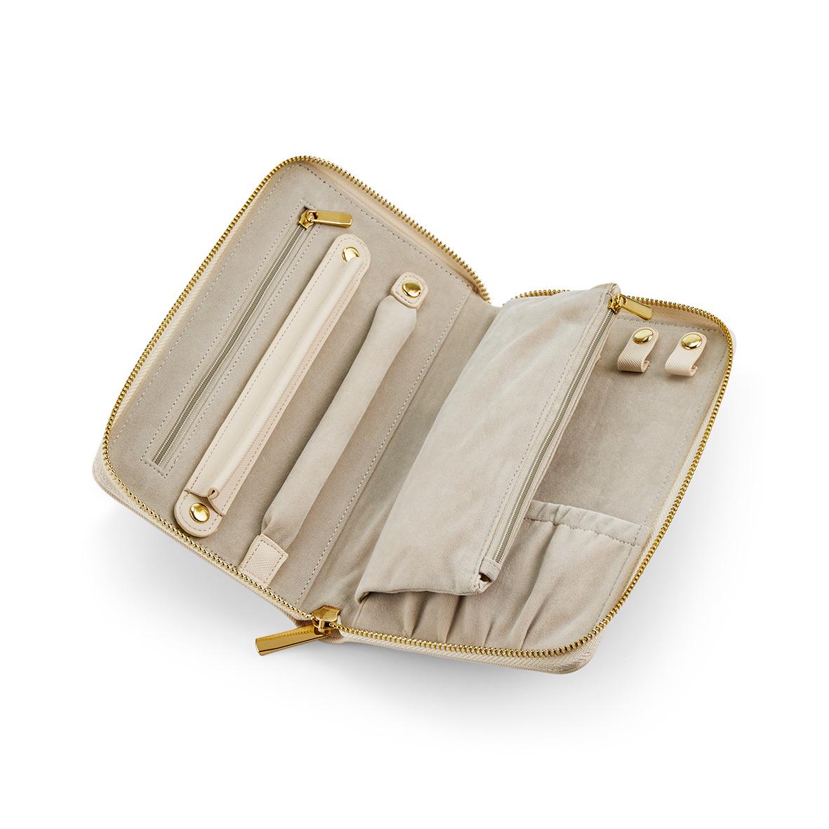 - Features: Necklace hooks, ring holder, detachable earring organiser, two zipped pockets, protective velvet lining, gold zip