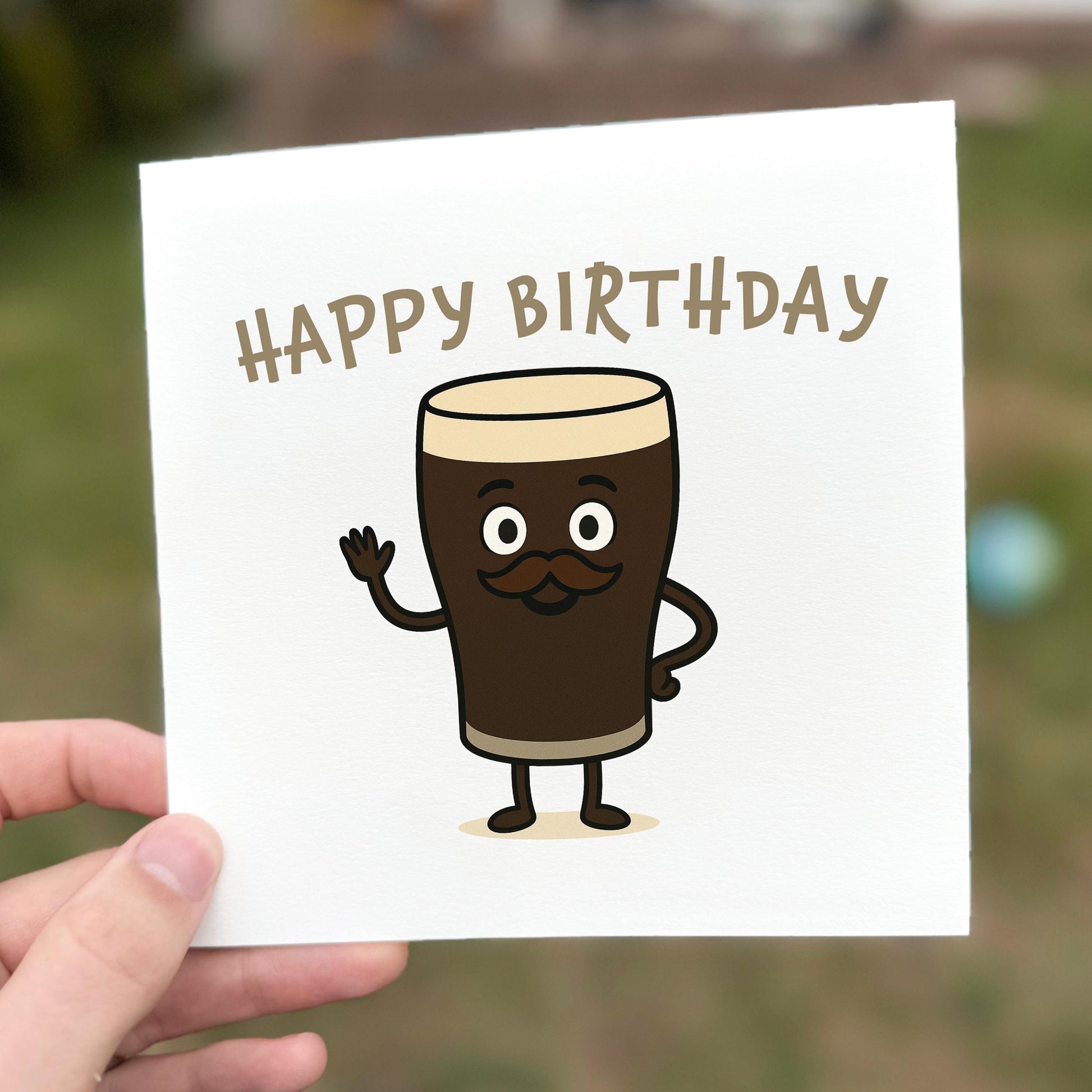 A fun birthday card for Guinness fans and stout lovers. Featuring a cartoon pint with a moustache and cheeky character, this card is perfect for anyone who loves Irish beer, pubs, and a laugh on their special day. A light-hearted and humorous design that works for friends, family, or colleagues.
