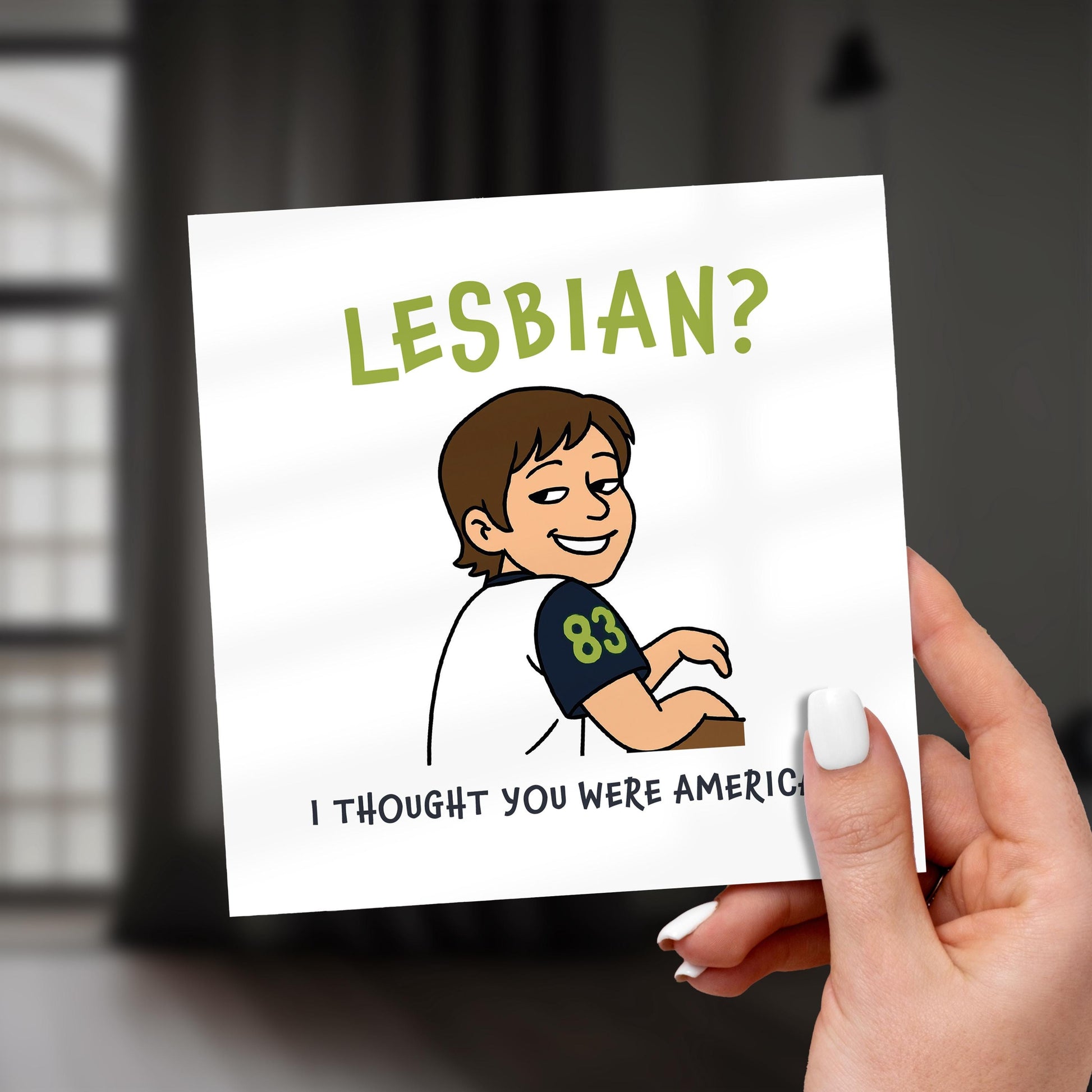 Celebrate love, pride and identity with a card that turns a classic Vine meme into a supportive and funny moment. With the caption “Lesbian? I thought you were American,” this card makes a brilliant coming out card, pride celebration, or just a lighthearted way to show support for your girlfriend, friend or loved one. Perfect for birthdays, anniversaries, or simply saying “I see you and love you.”