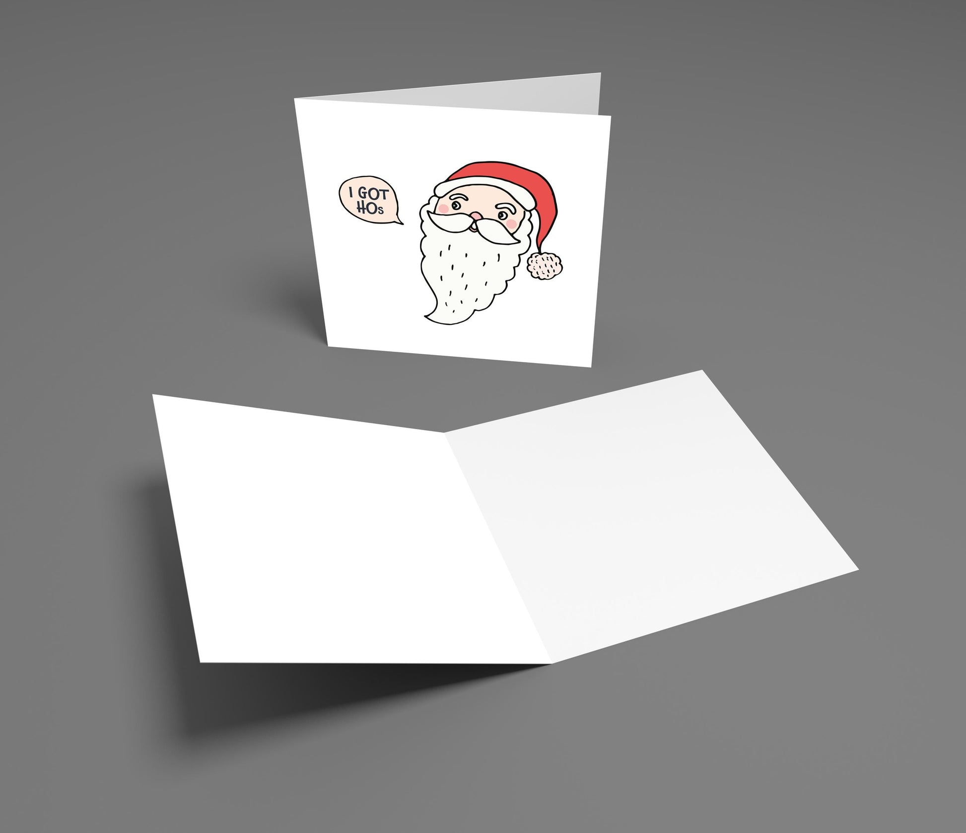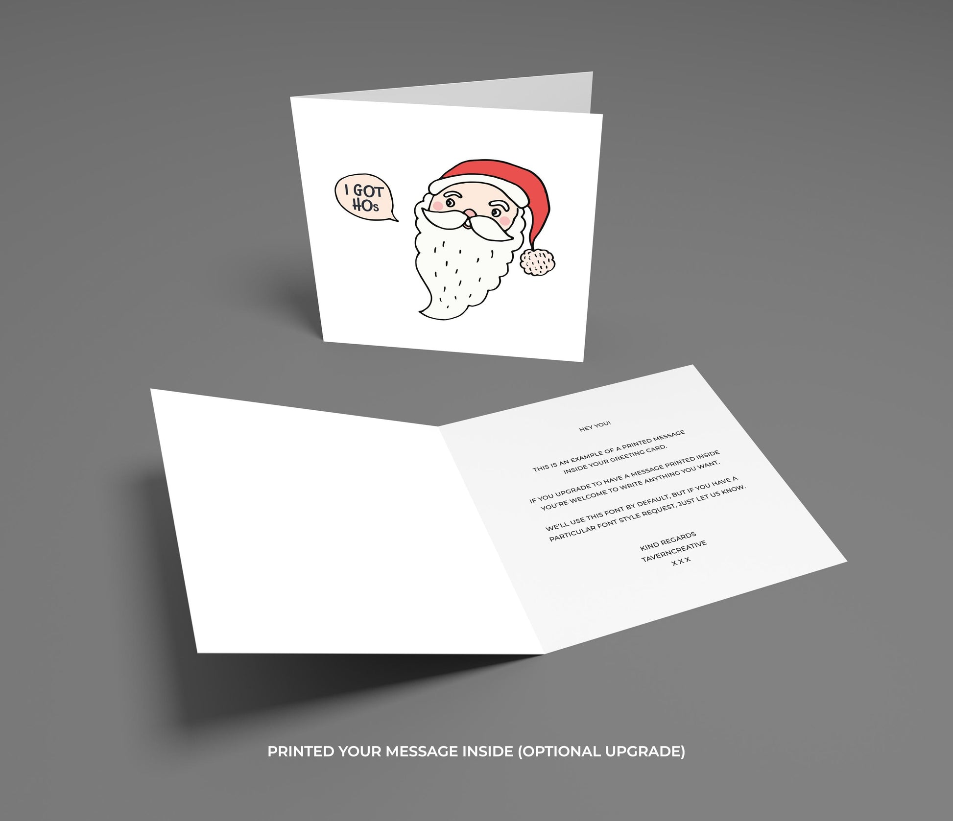 A cheeky Christmas card with a festive twist! Featuring Santa himself proudly declaring “I Got H0s”, this funny holiday card is perfect for friends, partners or anyone who enjoys a little humour with their Christmas spirit. A light-hearted design that’s sure to get a laugh around the dinner table or in the post.