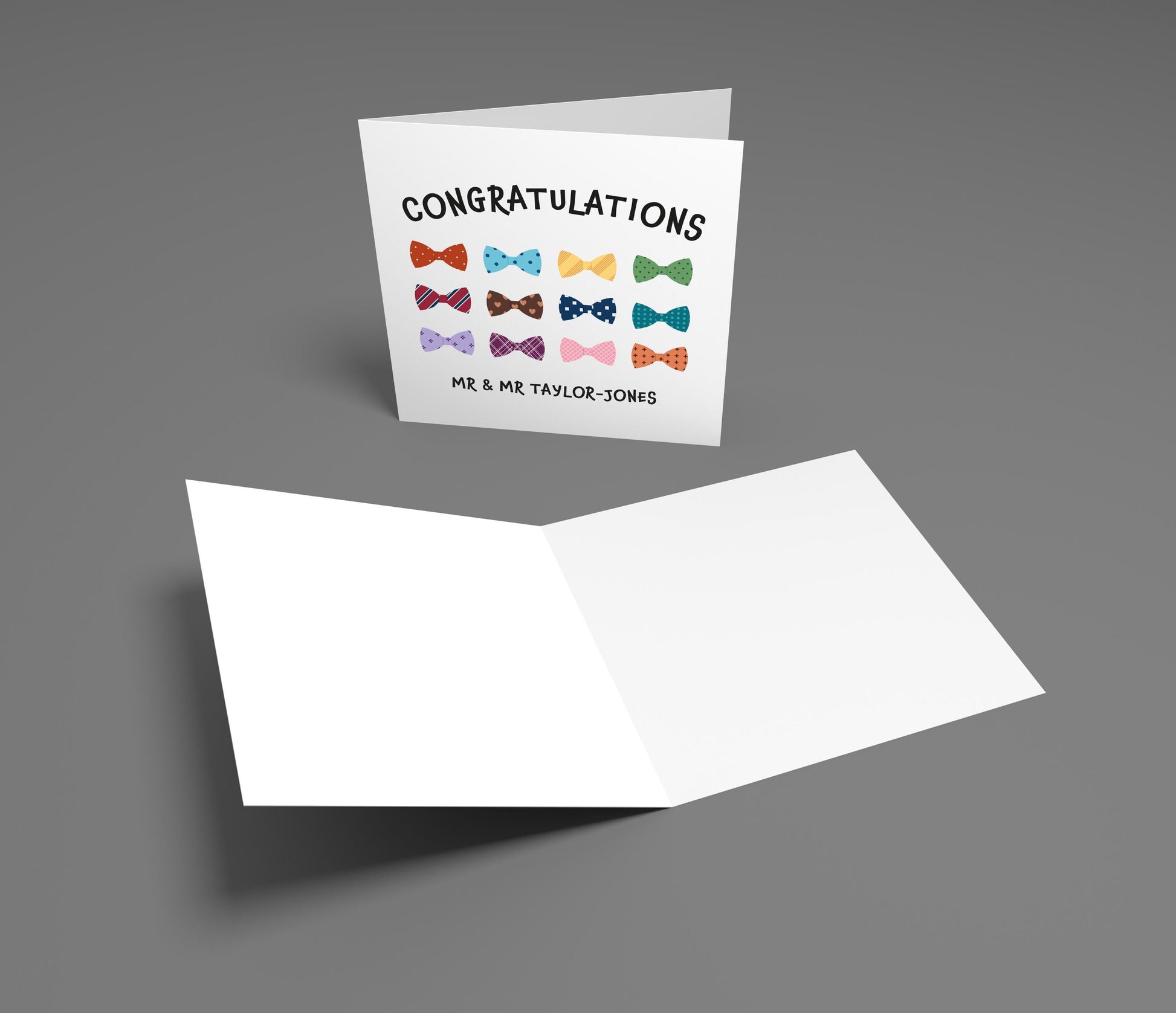 A fun and colourful way to celebrate two grooms tying the knot. This personalised Mr & Mr wedding card features a rainbow of patterned bow ties and bold black text - playful, inclusive, and perfect for a couple who deserves a card as vibrant as they are.